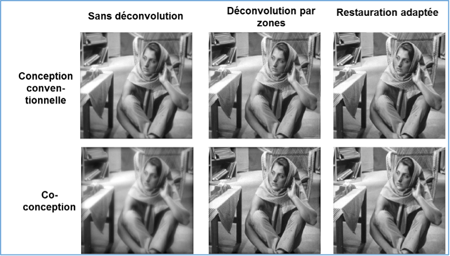 Notre équipe a travaillé sur ce sujet à travers les thèses de Marie-Anne Burcklen (2013-2017, thèse CIFRE Thales Angénieux) et Alice Fontbonne (cofinancée par la DGA) qui s’achève en 2021. Des méthodologies de co-conception optique ont été développées et validées sur différentes applications : augmentation de la profondeur de champ d’optiques complexes en utilisant des composants optiques « free-form », uniformisation de la qualité image dans le champ d’optiques à très forte ouverture, simplification de combinaisons optiques pour réduire leur coût. Grâce à ces travaux, nous avons une vision claire des défauts optiques qui peuvent être corrigés par le traitement d’images, et ceux qui doivent toujours l’être par des moyens optiques.